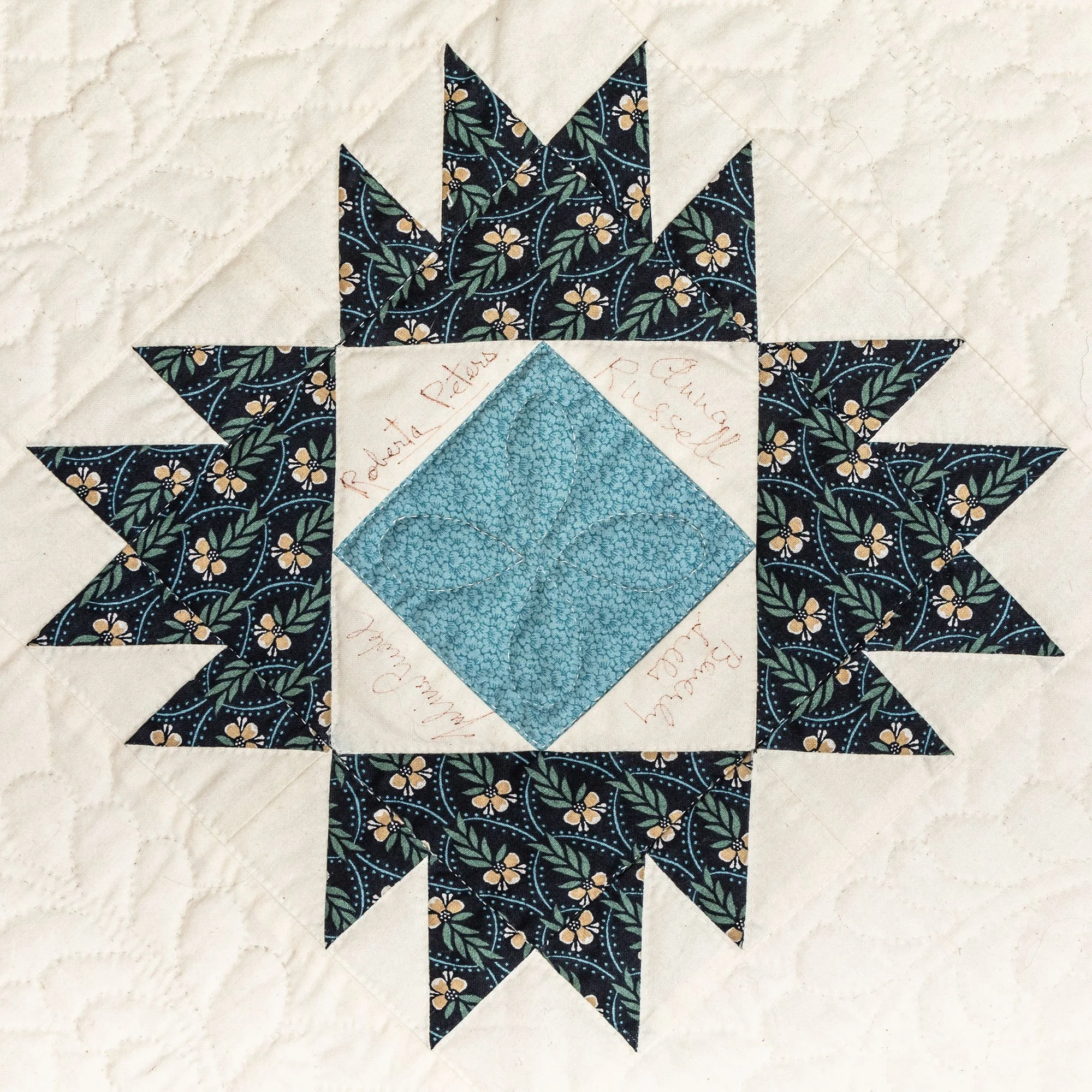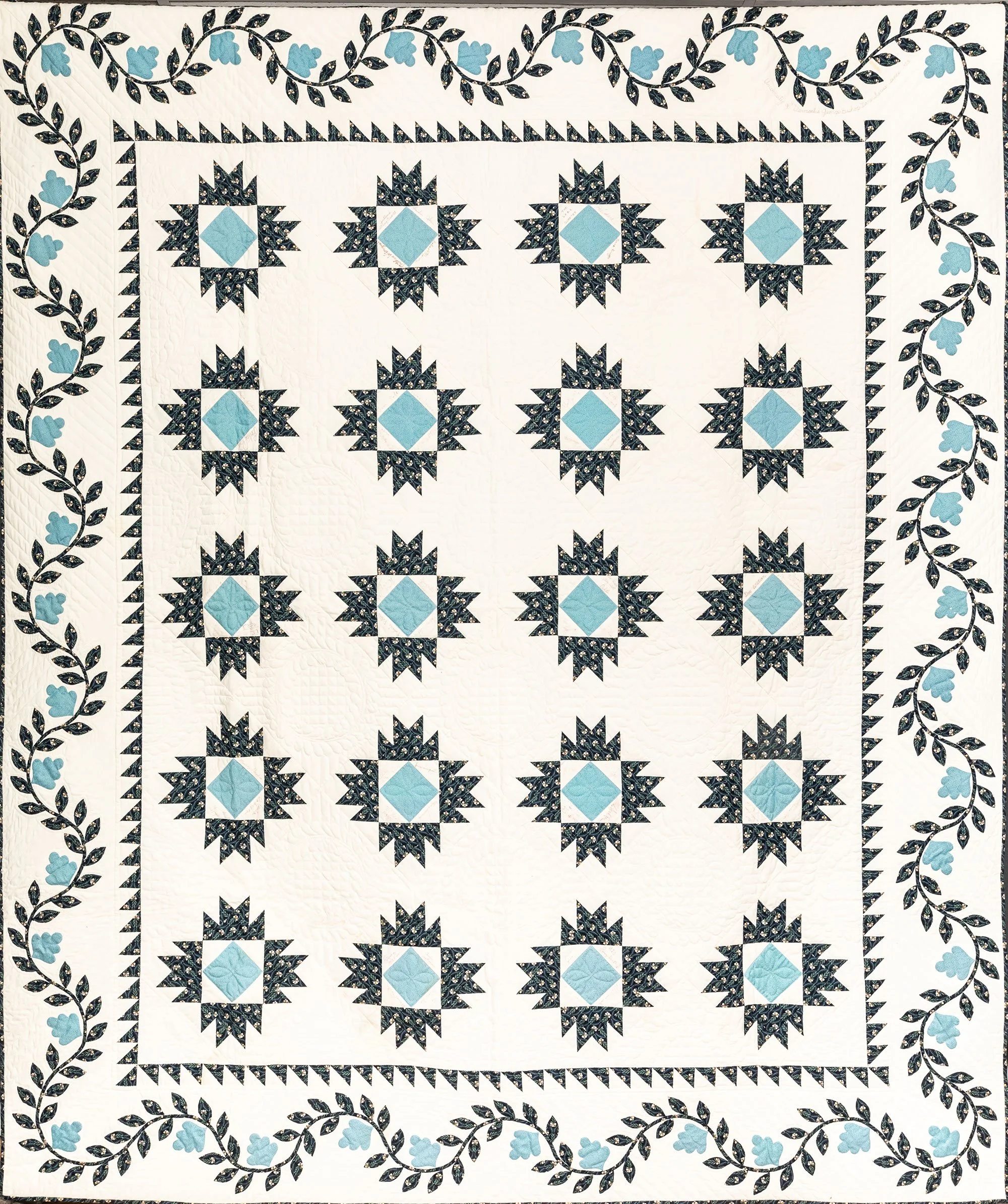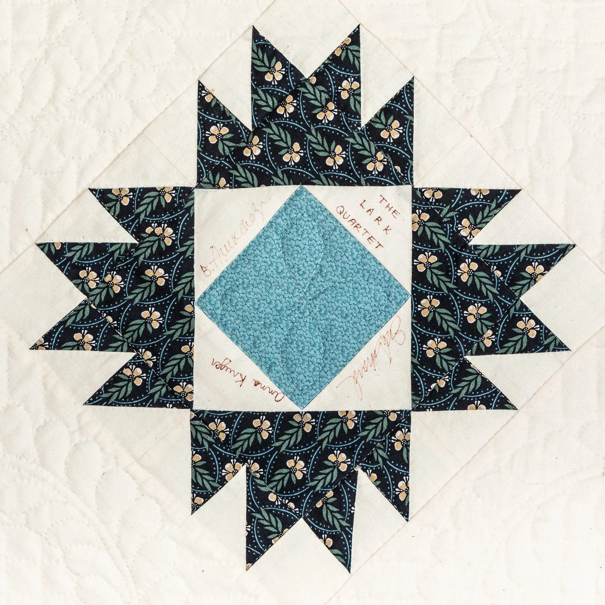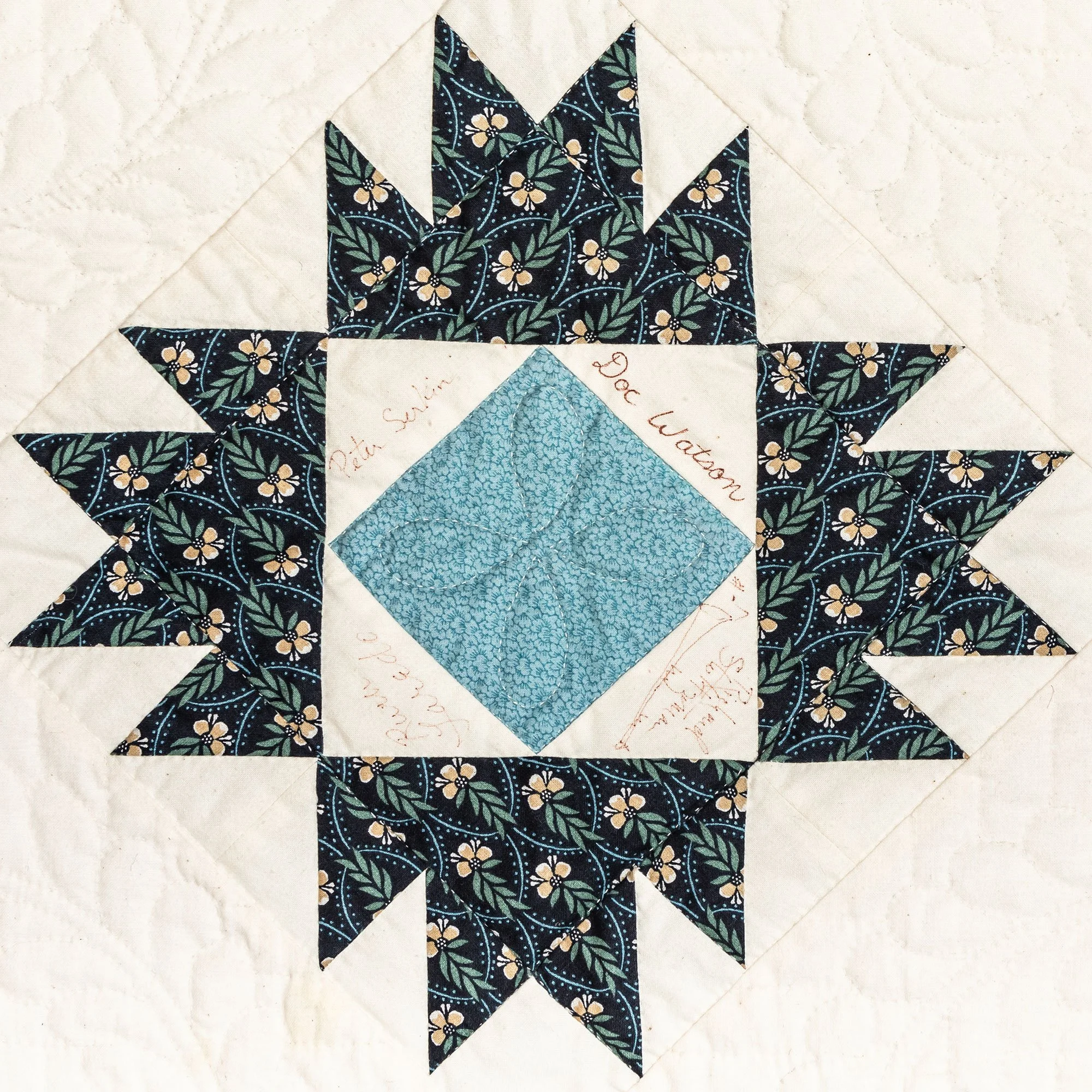 This commemorative quilt and two matching pillows was commissioned by the Lane Series Special Events Committee. It was begun in 1996 and completed in January, 2000 by the Quilters By The Lake for the Lane Series, sewn 8-10 stitches per inch by volunteering experts Aileen Chutter, Linda Gross, Barbara Moore, Pam MacPherson, Kim Kane, Valorie Pruitt, Elsie Smith, and Barbara W. Werle. The blue floral fabrics were reproductions (from the RJR Company) from an historic quilt in the Shelburne Museum quilt collection. The inner pattern of the quilt is Union Square with a border of appliqued vine and leaf. It features 60 signatures by artists who performed for the series during the decades of 1955-2000. The quilt was raffled as a fundraiser on October 14, 2000, during the Lane Series presentation of Aquila Theatre of New York and London’s ‘The Tempest’ at the Flynn Theatre. Proceeds created a revolving ‘Quilt Concert’ fund.