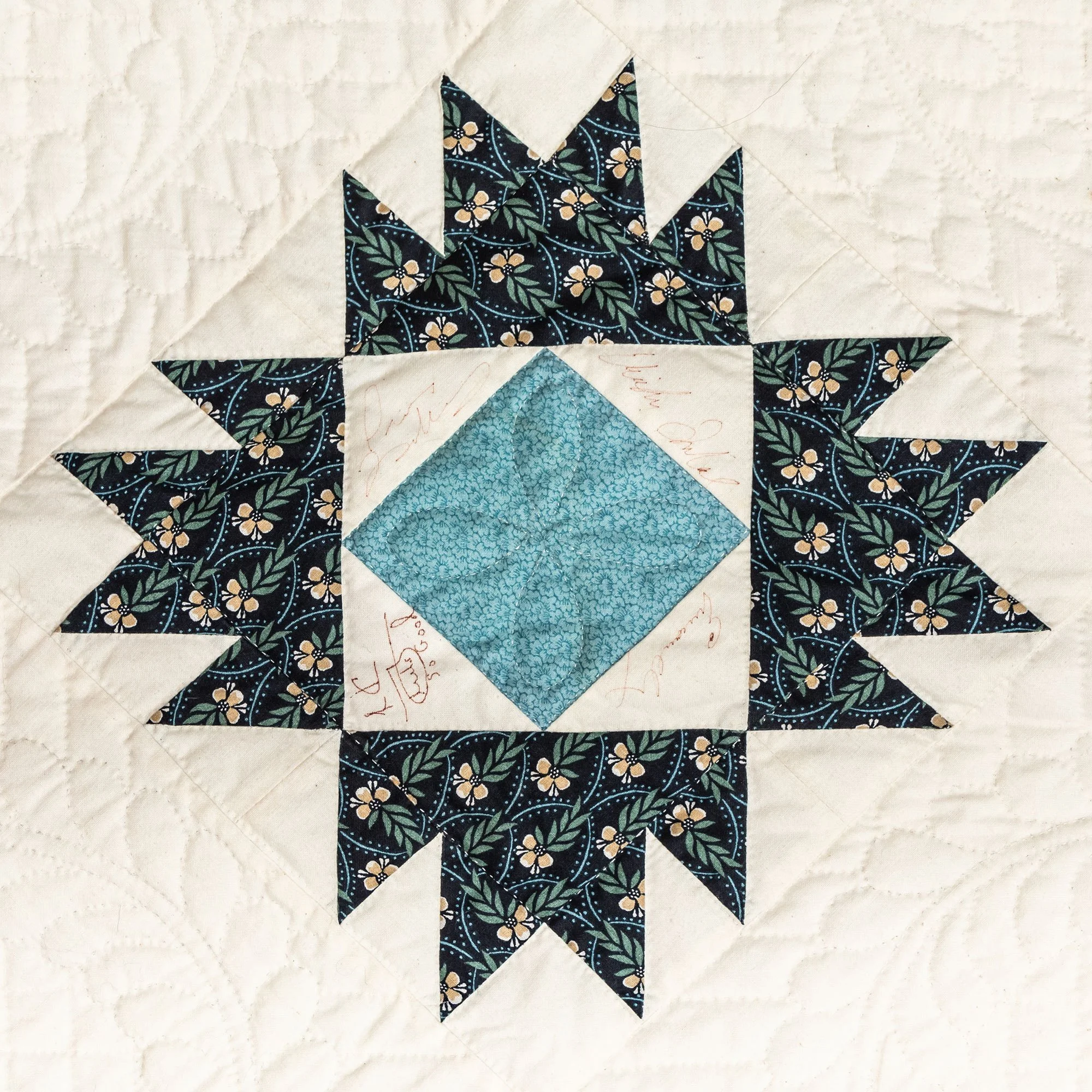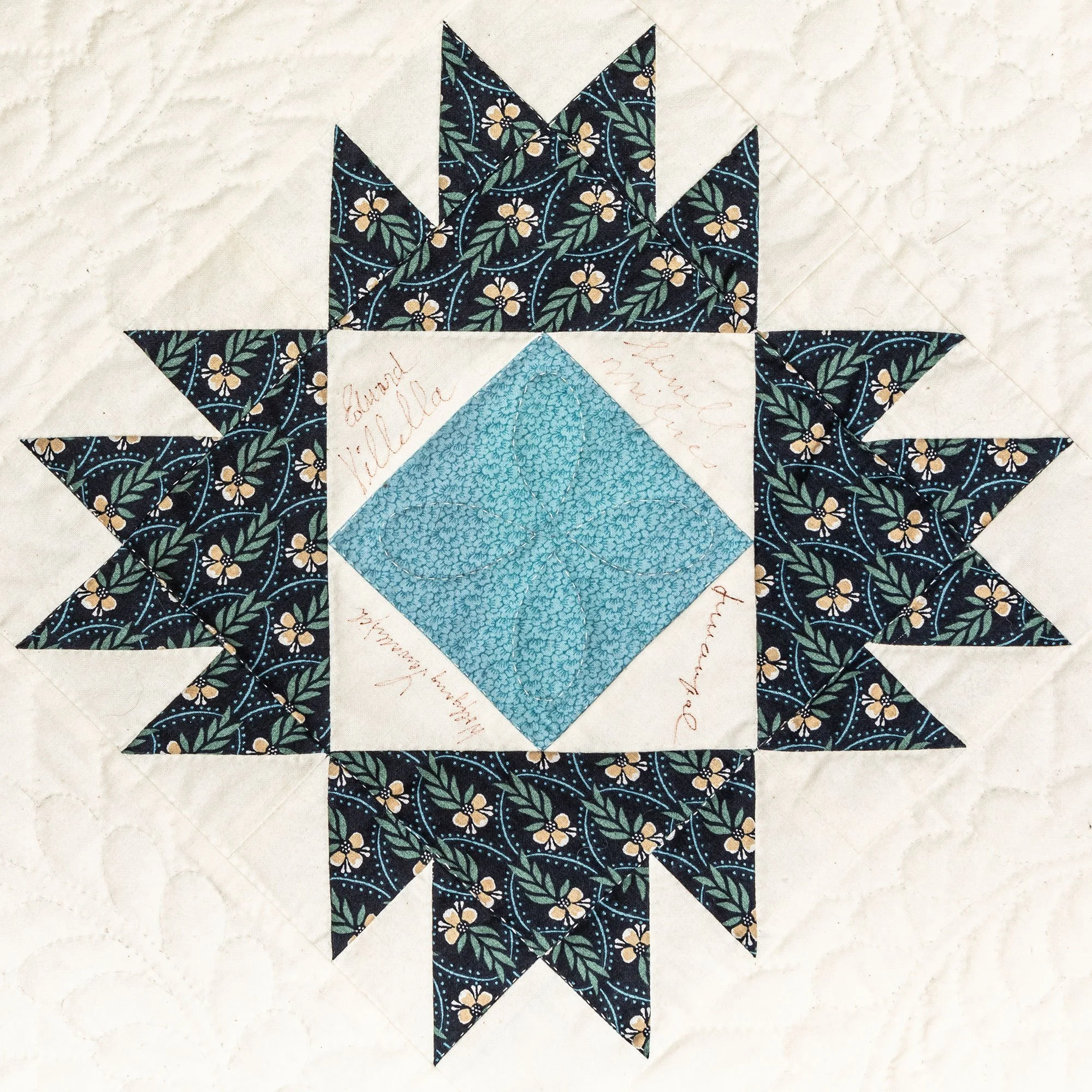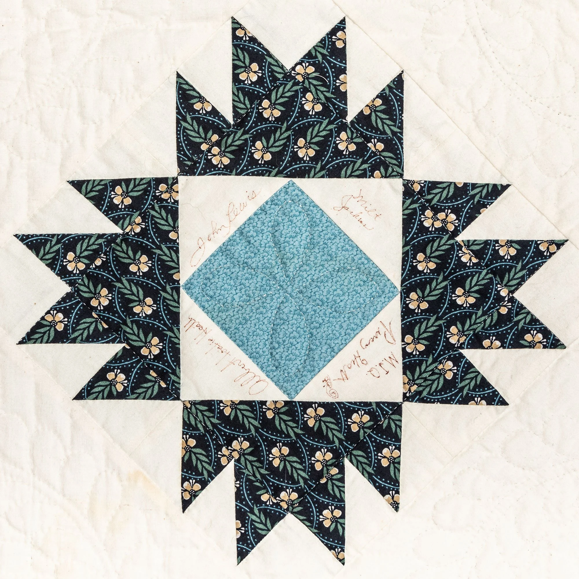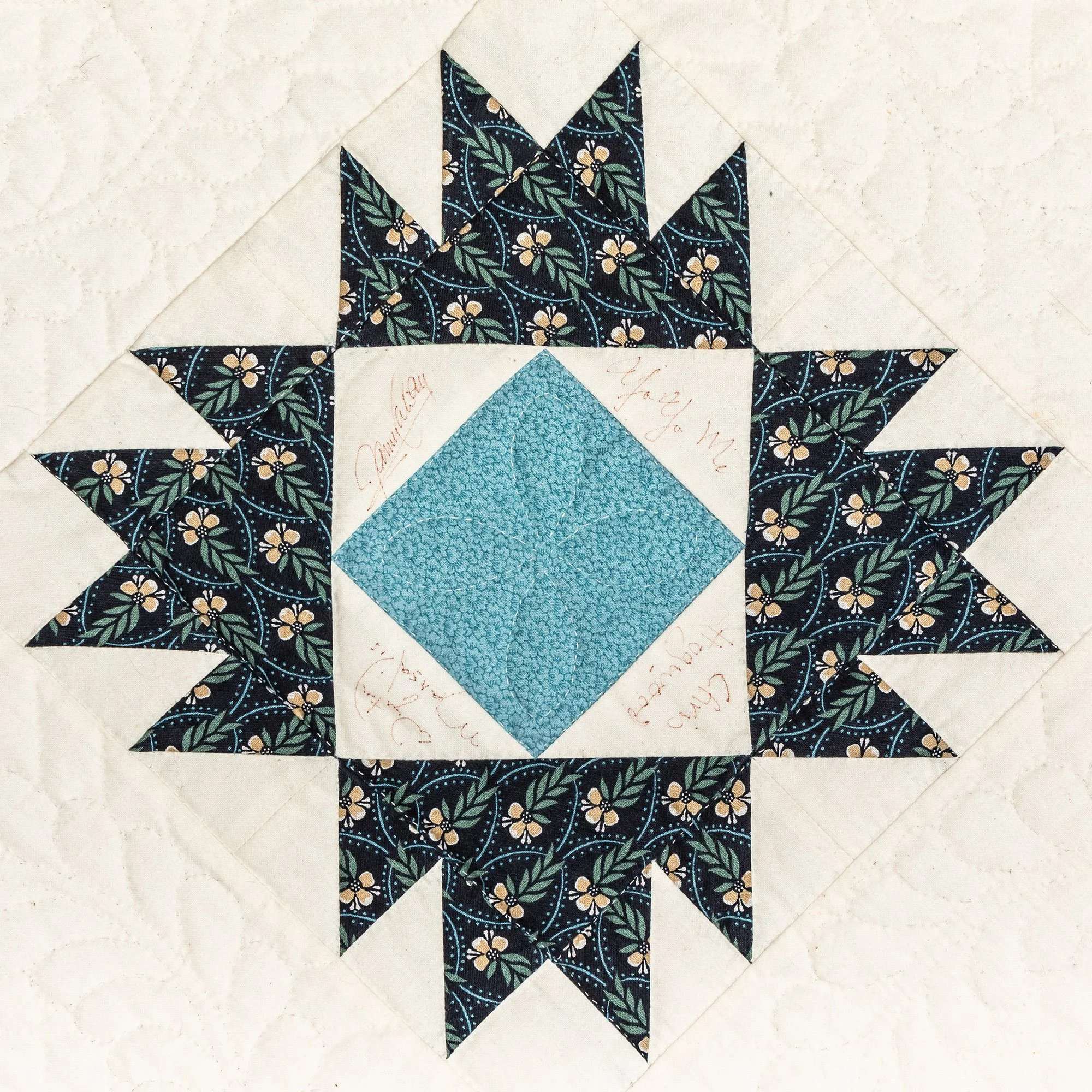 This commemorative quilt and two matching pillows was commissioned by the Lane Series Special Events Committee. It was begun in 1996 and completed in January, 2000 by the Quilters By The Lake for the Lane Series, sewn 8-10 stitches per inch by volunteering experts Aileen Chutter, Linda Gross, Barbara Moore, Pam MacPherson, Kim Kane, Valorie Pruitt, Elsie Smith, and Barbara W. Werle. The blue floral fabrics were reproductions (from the RJR Company) from an historic quilt in the Shelburne Museum quilt collection. The inner pattern of the quilt is Union Square with a border of appliqued vine and leaf. It features 60 signatures by artists who performed for the series during the decades of 1955-2000. The quilt was raffled as a fundraiser on October 14, 2000, during the Lane Series presentation of Aquila Theatre of New York and London’s ‘The Tempest’ at the Flynn Theatre. Proceeds created a revolving ‘Quilt Concert’ fund.