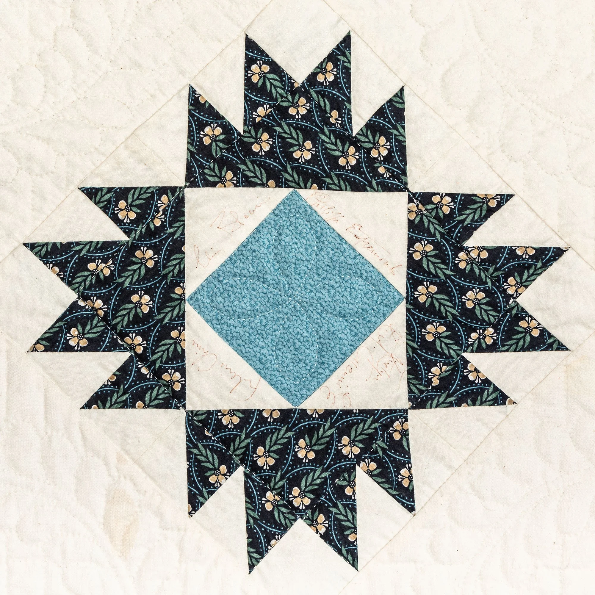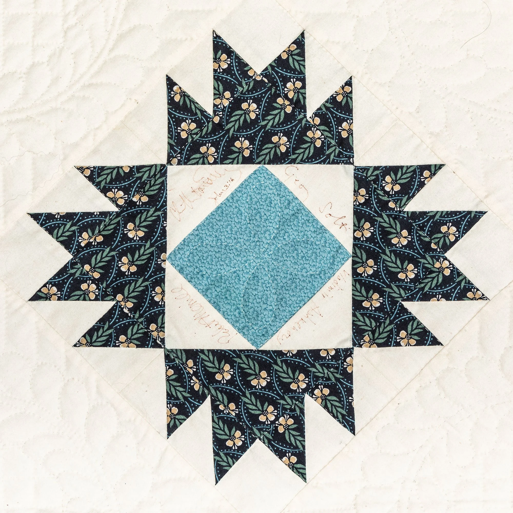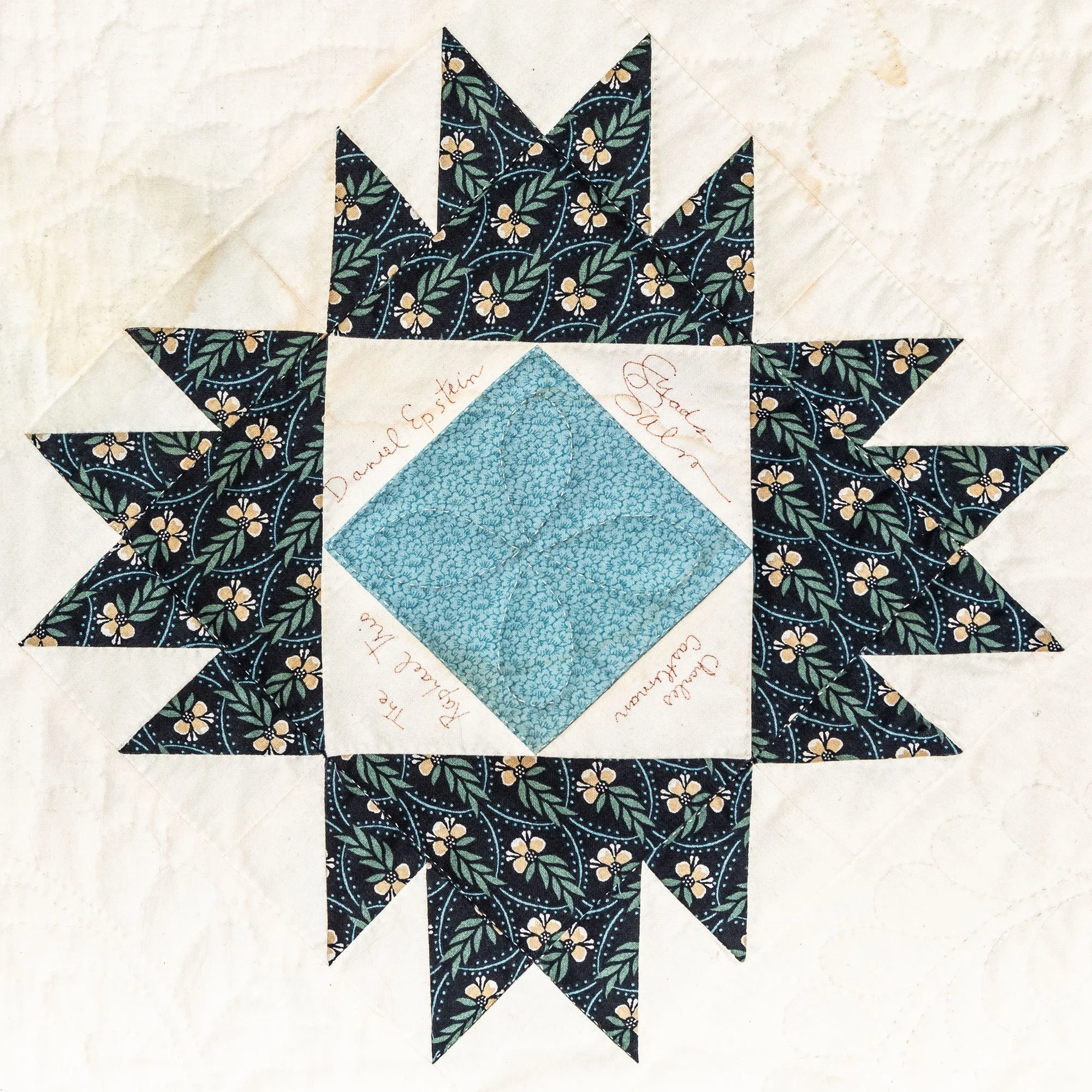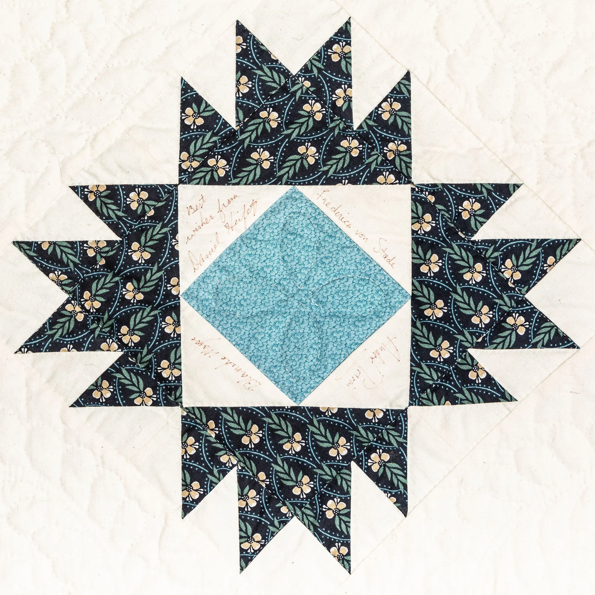This commemorative quilt and two matching pillows was commissioned by the Lane Series Special Events Committee. It was begun in 1996 and completed in January, 2000 by the Quilters By The Lake for the Lane Series, sewn 8-10 stitches per inch by volunteering experts Aileen Chutter, Linda Gross, Barbara Moore, Pam MacPherson, Kim Kane, Valorie Pruitt, Elsie Smith, and Barbara W. Werle. The blue floral fabrics were reproductions (from the RJR Company) from an historic quilt in the Shelburne Museum quilt collection. The inner pattern of the quilt is Union Square with a border of appliqued vine and leaf. It features 60 signatures by artists who performed for the series during the decades of 1955-2000. The quilt was raffled as a fundraiser on October 14, 2000, during the Lane Series presentation of Aquila Theatre of New York and London’s ‘The Tempest’ at the Flynn Theatre. Proceeds created a revolving ‘Quilt Concert’ fund.