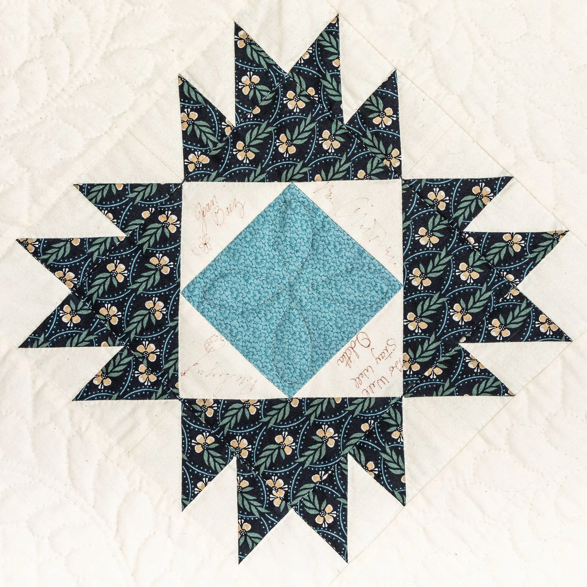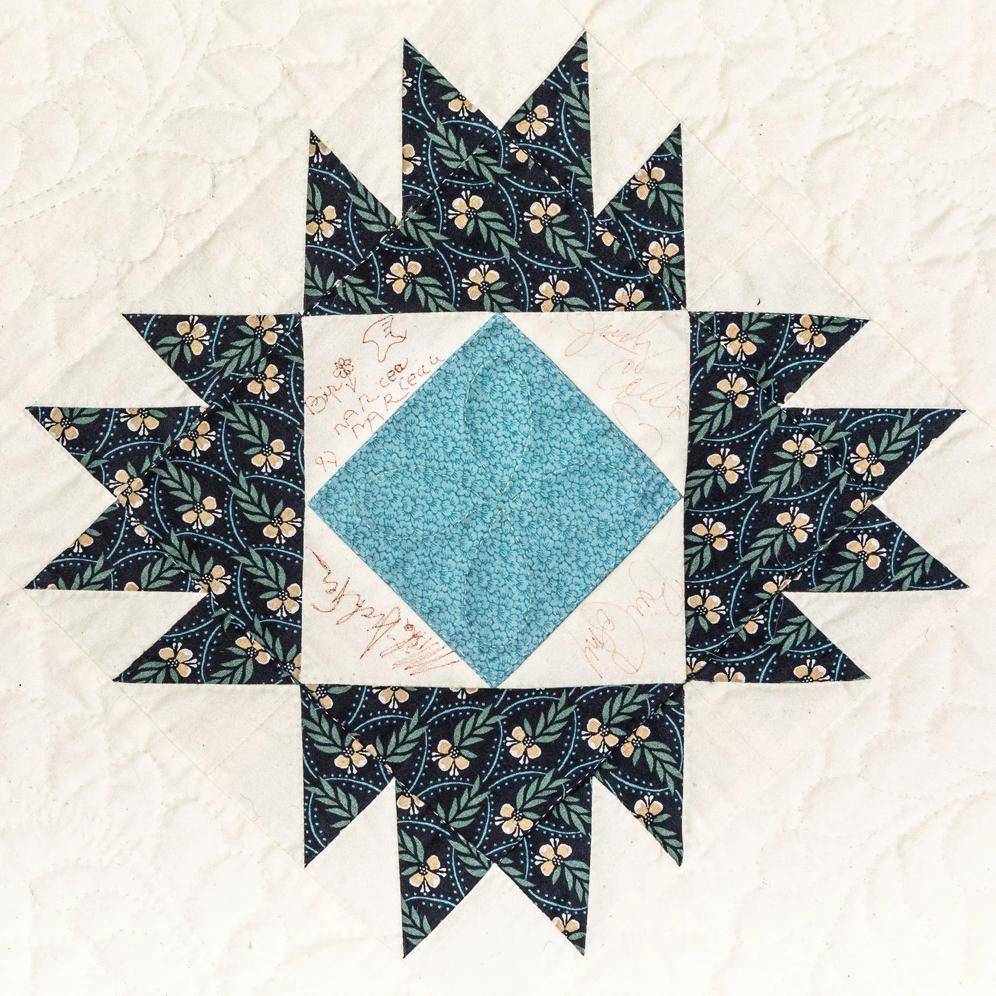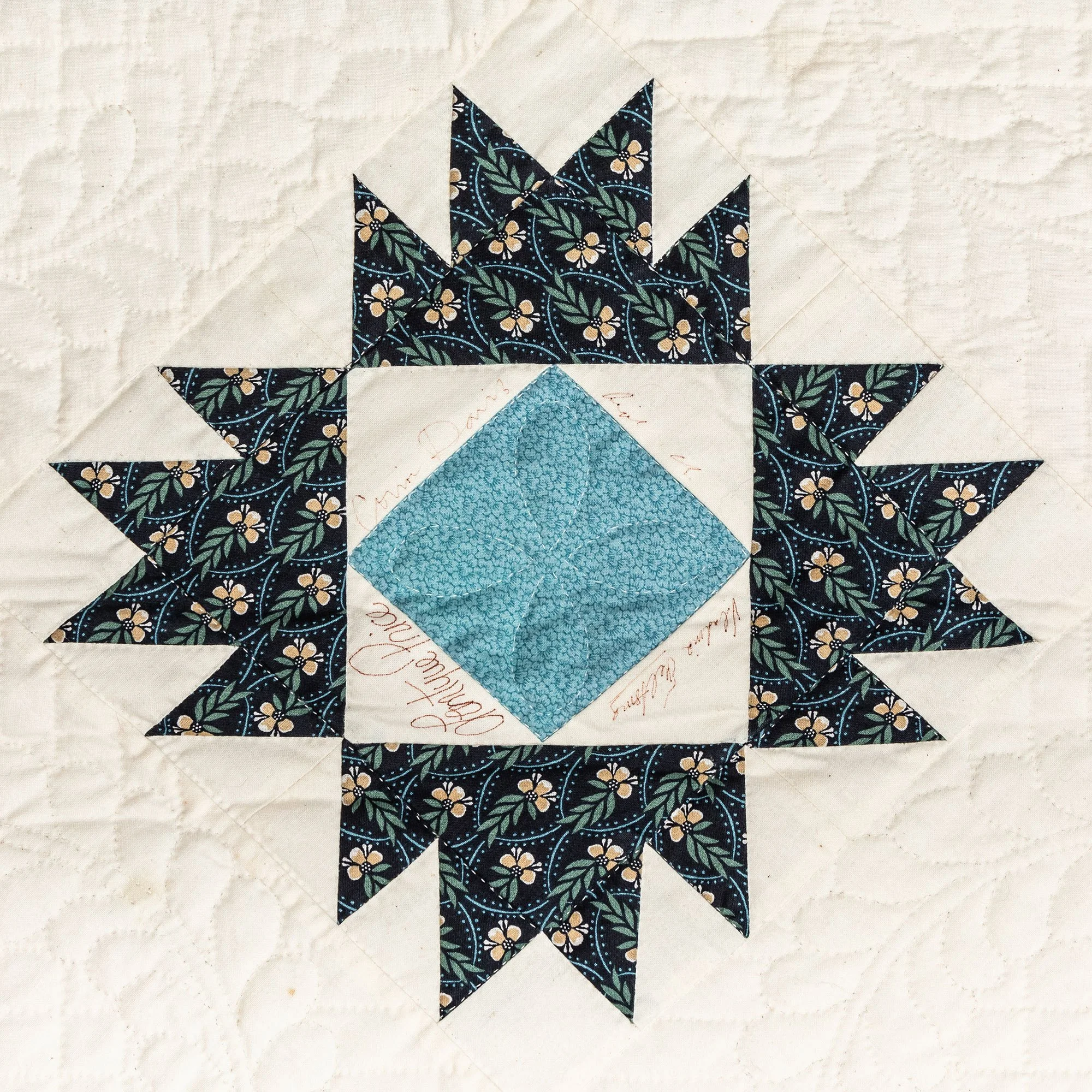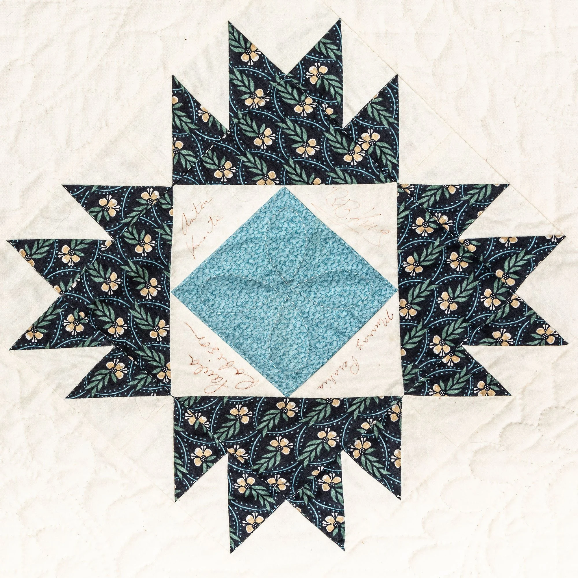 This commemorative quilt and two matching pillows was commissioned by the Lane Series Special Events Committee. It was begun in 1996 and completed in January, 2000 by the Quilters By The Lake for the Lane Series, sewn 8-10 stitches per inch by volunteering experts Aileen Chutter, Linda Gross, Barbara Moore, Pam MacPherson, Kim Kane, Valorie Pruitt, Elsie Smith, and Barbara W. Werle. The blue floral fabrics were reproductions (from the RJR Company) from an historic quilt in the Shelburne Museum quilt collection. The inner pattern of the quilt is Union Square with a border of appliqued vine and leaf. It features 60 signatures by artists who performed for the series during the decades of 1955-2000. The quilt was raffled as a fundraiser on October 14, 2000, during the Lane Series presentation of Aquila Theatre of New York and London’s ‘The Tempest’ at the Flynn Theatre. Proceeds created a revolving ‘Quilt Concert’ fund.