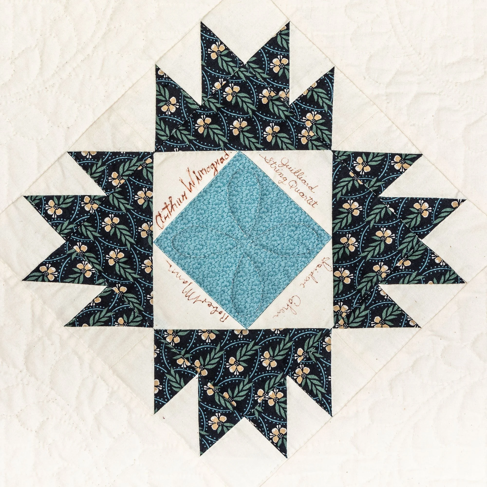 Artist signatures found on the quilt include the Juilliard String Quartet, Arthur Winograd, Robert Mann, Isadore Cohen, Anna Russell, Beverly Sills, Julius Rudel, Roberta Peters, Philippe Entrement, Frederic Chiu, Clair Bloom, Evelyn Glennie, Sir Colin Davis, Leontyne Price, Angela Cheng, Vladimir Feltsman, Peter Serkin, Richard Stoltzman, Ruth Laredo, Doc Watson, Blanche Moyse, Andre Previn, Frederica von Stade, Daniel Heifetz, Robert Merrill, Sir Georg Solti, Christopher Parkening, Vladimir Askhenazy, Odetta, Pete Seeger, Van Cliburn, Joan Baez, Milt Jackson, Percy Heath, John Lewis, Albert "Tootie" Heath, Bill Cosby, Judy Collins, Marcel Marceau, Misha Dichter, Raphael Trio, Charles Castleman, Susan Saim, Daniel Epstein, Christopher Hogwood, Yo Yo Ma, James Galway, Wynton Marsalis, Chuck Mangione, Emanuel Ax, Eliahu Inbal, Pinchas Zukerman, Wolfgang Sawallisch, Sherrill Milnes, Edward Villella, Jean-Pierre Rampal, Murray Parahia, Paula Robinson B.B. King, and Anton Kuerti.